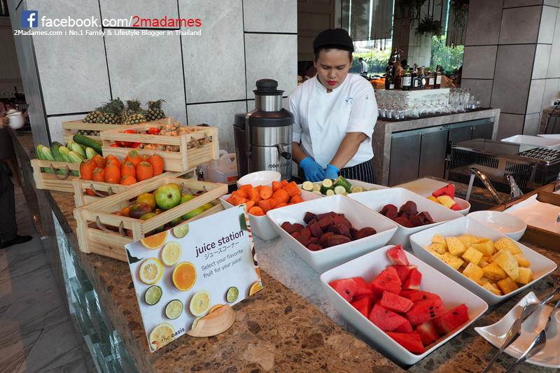 โดยรวมแล้วอาหารครบถ้วนดี อาหารค่อนข้างหลากหลาย เดี๋ยวจะเล่าให้ฟังในส่วนที่น่าสนใจและห้ามพลาดละกัน อย่างแรกที่ประทับใจคือมุมน้ำผลไม้แยกกาก ที่สามารถเลือกผักผลไม้ในสัดส่วนที่ชื่นชอบให้พนักงานทำให้เลย ผักผลไม้ก็หลากหลายดี ถ้าแช่เย็นมาด้วยจะยอดเยี่ยมมาก