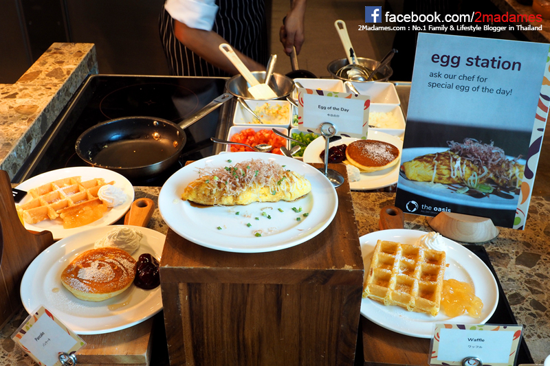 ในส่วน Egg Station สามารถสั่งได้ทั้งเมนูไข่ Egg of the Day ที่เป็นออมเล็ตเลือกเครื่องได้ตามชอบ ที่พิเศษคือมีราดซอสเหมือนเวลาเราทานทาโกะยากิด้วย เข้ากันได้ดีมาก แพนเค้ก วอฟเฟิล ก็สั่งทำสดใหม่เสิร์ฟกันร้อนๆที่โต๊ะเลย แค่เอาตัวหนีบเบอร์โต๊ะมาสั่ง สะดวกมากๆ