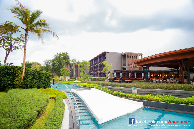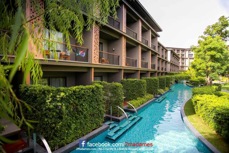 สระว่ายน้ำจะวนเป็นวงกลมผ่านห้องพักที่เป็นแบบ Pool Access ตามอาคารต่างๆ