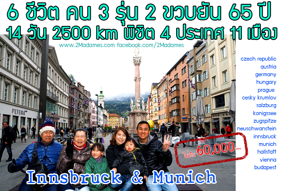 ตอนนี้เดินทางมาถึงตอนที่ 7 ของทริป 6 ชีวิต คน 3 รุ่น 2 ขวบยัน 65 ปี กับ 14 วัน 2,500 km พิชิต 4 ประเทศ 11 เมือง จากตอนที่แล้วเราเดินทางไปเที่ยวเยอรมันใต้มา ส่วนทริปตอนนี้ครอบครัวเราเดินทางกลับมาประเทศออสเตรียอีกครั้ง โดยเราจะไปเที่ยวเมืองอินส์บรุค Innsbruck เมืองหลวงของแคว้นทิโรล ซึ่งขึ้นชื่อว่าเป็นเมืองที่มีอากาศดี ทิวทัศน์สวยงาม ด้วยมีแม่น้ำสำคัญอย่างแม่น้ำอินส์ไหลผ่าน อันเป็นที่มาของชื่อเมือง รวมทั้งเมืองยังถูกล้อมรอบด้วยภูมิประเทศที่เป็นขุนเขา เวลาเราเดินอยู่ในเมือง จึงรู้สึกเหมือนอยู่ในอ้อมกอดของขุนเขา นอกจากนี้ จะพาไปเที่ยวเมืองมิวนิค Munich ซึ่งเดิมทีไม่ได้อยู่ในแผนการเดินทาง แต่ด้วยสภาพอากาศที่ Hallstatt จุดหมายที่ตั้งใจไว้ มีพายุ พวกเราจึงเปลี่ยนแผนเที่ยวมิวนิคเสียเลย ทั้งหมดนี้คือ การเดินทางของรีวิวตอนนี้ครับ จะสนุกสนานและสวยงามแค่ไหน ตามรับชมรีวิวกันครับ