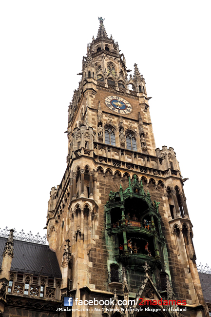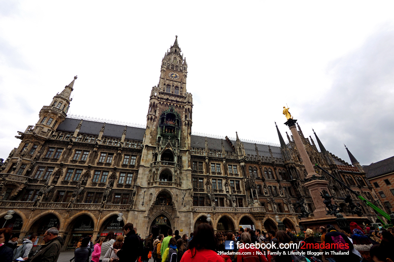 อาคารที่เด่นเป็นสง่าตรงหน้าจัตุรัส คือศาลาว่าการเมืองหลังใหม่ เรียกว่า นอยเยอรัทเฮาส์ (Neue Rathaus) สร้างในสไตล์นีโอโกธิกในกลางคริสตศตวรรษที่ 19 มีหอคอยสูงกว่า 80 เมตร ตรงกลางหอคอยมีหอนาฬิกาที่เรียกว่า Glockenspiel ซึ่งจะมีตุ๊กตาออกมาเต้นระบำให้ชมกันในเวลา 11 นาฬิกา และเที่ยงตรง ในหน้าร้อนจะเพิ่มรอบ 5 โมงเย็นอีกหนึ่งรอบ