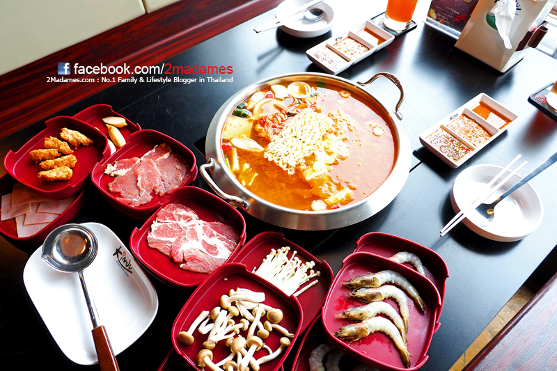 ใส่เครื่องลงไปล้นๆเลยคะ สุกแล้วตักทานทีเดียว 555 สำหรับน้ำซุปแอนว่ารสจัดไม่พอ เลยประโคมพริกเกาหลีแบบน้ำจิ้มช่องกลางลงไปอีกชุดใหญ่ ปรากฎได้รสชาติที่ถูกใจขึ้นมากมายเลย แต่มีตินิดนึงตรงที่นี่น่าจะมีผ้ากันเปื้อนแบบพลาสติกมาบริการให้หน่อยคะ เพราะเวลาน้ำซุปเดือดปุดๆ มันกระเด็นโดนเสื้อเป็นจุดๆ เป็นสีกิมจิแบบในหม้อเลย แงๆๆๆ