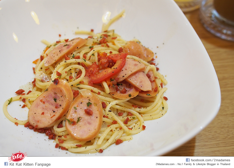 และแล้วอาหารที่เหมียวๆรอก็มาแล้วค่ะ พาสต้าที่สั่งไว้นั่นเอง โรยเบคอนกรอบๆมาด้วย พร้อมกับไส้กรอกเด้งๆ อร่อยมากๆค่ะ เมนูนี้ชื่อว่า คาราแมววซอสเซส