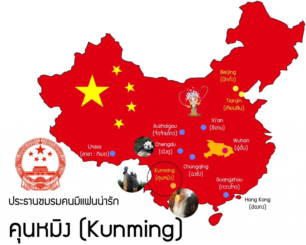 คุนหมิงตั้งอยู่ในมณฑลยูนนาน ซึ่งอยู่ทางตอนใต้ของประเทศจีน ด้านล่างมีอาณาเขตติดต่อทั้งพม่า ลาว และเวียดนาม บริเวณบางส่วนของมณฑลก็มีชนชาติไทยใหญ่ที่มีภาษาใกล้เคียงกับทางเชียงใหม่ของเราด้วย