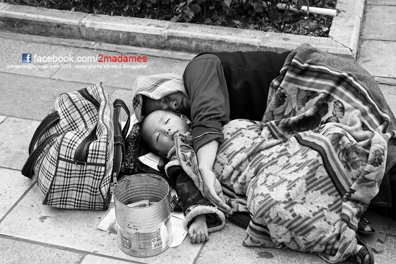 แม่ลูกขอทานนอนกอดกันย่านถนนคนเดิน