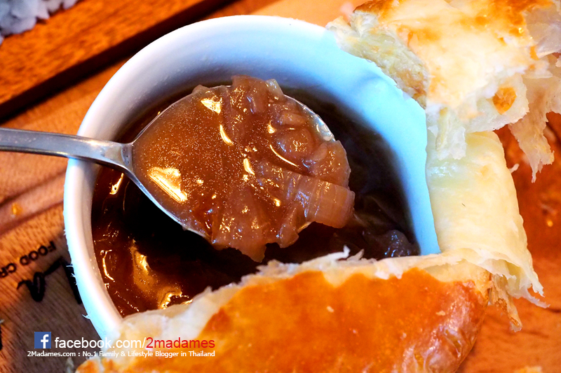 Starter อีกจานที่พวกเราลิ้มลองแล้วปลาบปลื้มกันมากเป็น “French Onion Soup in Puff Dome” ราคา 250++ บาท เป็นซุปหอมหัวใหญ่สไตล์ฝรั่งเศส ที่เห็นสีน้ำตาลพองๆ นั่นคือ โดมแป้งพัฟที่เรียกว่าอบใหม่ๆทันทีที่สั่งเลย