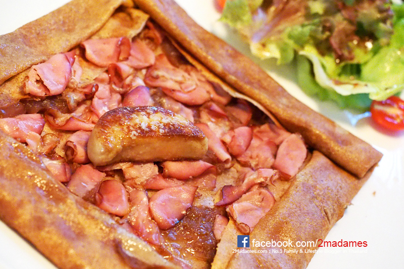 มาทานร้านอาหารฝรั่งเศสทั้งที ต้องลองสั่งเครปมาทานดูนะ “La Bécassine Crepe” (เครปอกเป็ดรมควันและฟัวกราส์) ราคา 290++ บาท ขอบอกเลยว่า เป็นอะไรที่ไม่ควรพลาดด้วยประการทั้งปวง เพราะร้านเค้าใช้แป้งบัควีท (Buckwheat) ทำเนื้อเครปช่วยให้แป้งนุ่มเนียน แถมยังหอมกลิ่นอกเป็ดรมควันแล่บางๆโรยมาทั่วเครปเลย รสชาติอกเป็ดรมควันที่ออกเค็มหน่อยๆ ผสมผสานกับซอสหวานๆ ที่ปรุงจากหอมหัวใหญ่และมะม่วง เป็นอะไรที่ลงตัวมากๆ ที่สำคัญพระเอกจานนี้ อยู่ที่การเสิร์ฟ ฟัวการ์ชิ้นโตที่ทอดมากำลังดี เนื้อในนุ่ม ทานได้อร่อยไม่เลี่ยนเลย