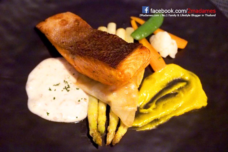 มาต่อที่จานหลักจานสุดท้ายกันที่ “Salmon Steak” (แซลมอนเสต็ก) ราคา 450++ บาท เนื้อปลาสดมาก ย่างให้สุกกำลังดี juicy หน่อยๆ เสิร์ฟพร้อมราวิโอลี (Ravioli) ปู และไวท์ซอสที่รสชาติเปรี้ยวเล็กๆ และคู่หน่อไม้ฝรั่ง (Asparagus) หวานๆ ย่างสุกกำลังดี เคียงจานมาด้วย