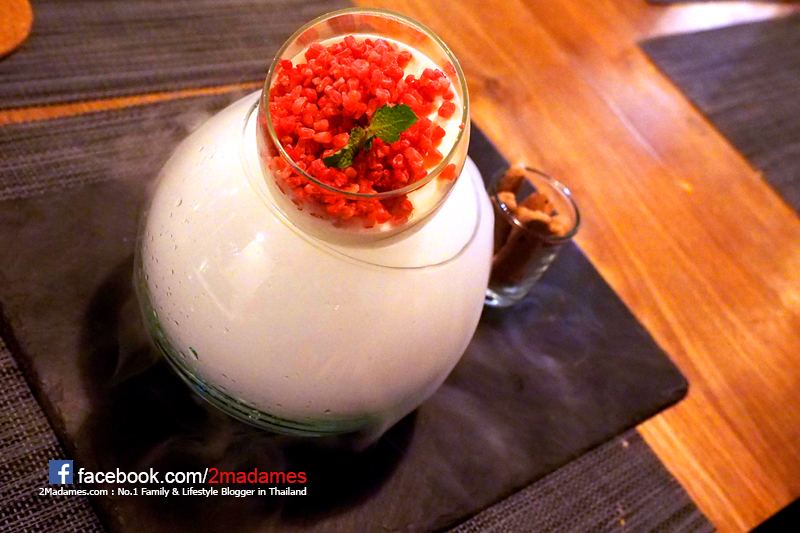 มาที่ของหวานกันบ้าง ต้องบอกว่าของหวานที่นี่ถือเป็นไฮไลท์ของร้าน La Maison 15 แห่งนี้ ไม่น้อยหน้าจานหลักเลย เราลองสั่ง “White Pannacotta and Black Meringue” (พานาคอตต้าไวท์ช็อคโกแลต ราสเบอร์รี่สโนว และดาร์คช็อคโกแลตเมอแรง) มาลองดูต้องบอกว่า พรีเซนต์เตชั่นชนะเลิศ ทำเอาเด็กๆ ตื่นตาตื่นใจกันใหญ่ เพราะร้านเค้าเสิร์ฟไวท์ช็อคโกแลตพานาคอตต้าเนื้อนุ่มๆ โรยหน้ามาด้วยเกล็ดราสเบอร์รี่สโนว์ ที่นำราสเบอร์รี่สด ไปแช่แข็ง แล้วนำมาปั่นเป็นเกล็ดหิมะ ให้รสชาติหวานซ่อนเปรี้ยวได้ดีมากๆ ถ้าใครชอบทานรสชาติเข้มๆ เค้าก็มีเสิร์ฟดาร์ดช็อคโกแลตเมอแรงให้ทานคู่กันด้วยนะ