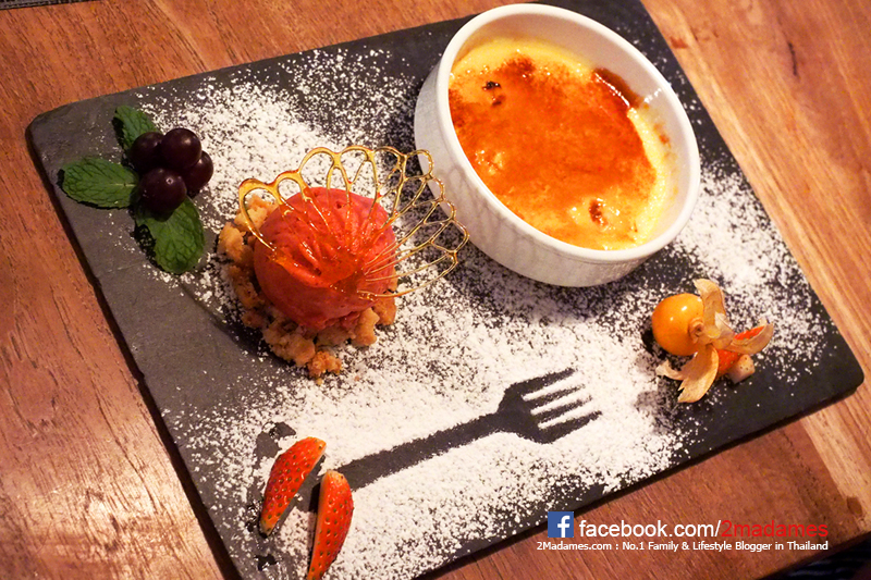 ยังไม่จบจ้า สั่ง “Crème brûlée with raspberry sherbet” (เครมบูเล่และไอศกรีมราสเบอร์รี่) ราคา 210++ บาท มาลองอีกสักอย่าง เครมบูเรหรือคัสตาร์ดสไตล์ฝรั่งเศสสูตรเฉพาะของ La Maison 15 เนื้อคัสตาร์ดหอมกลิ่นวนิลาและผิวส้มอ่อนๆ ชอบตรงส่วนที่เผาหน้าด้วยน้ำตาล จนเป็นคาราเมลหวานกรอบที่ความหนาพอดีๆ แถมมีไอศกรีมราสเบอร์รี่มาตัดรสชาติหวานออกไป เรียกว่าเป็นของหวานที่อร่อยลงตัวมากๆ