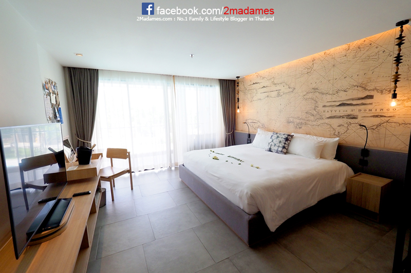 ด้านหลังเตียงตกแต่งด้วยภาพแผนที่สวยๆ