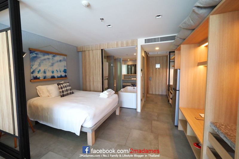ระหว่างเตียง 2 เตียงจะมีฉาก Partition ซึ่งสามารถเลื่อนได้ จะเปิดให้ห้องกว้างขึ้นก็ได้ หรือจะปิดเพื่อเพิ่มความเป็นส่วนตัวก็ดี