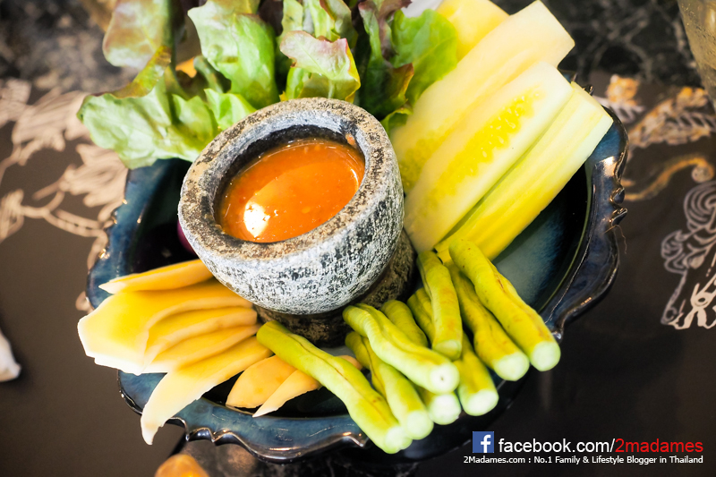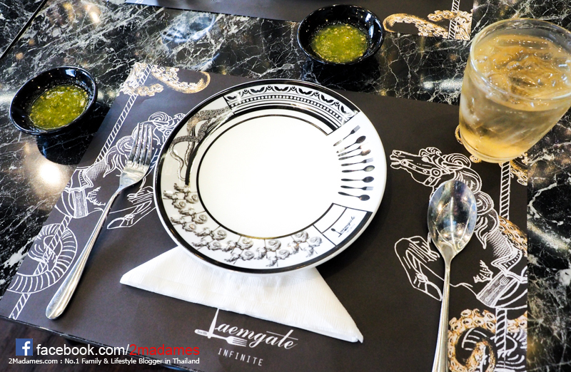 จานที่ใช้ก็ดูหรูหรา นั่งปุ๊บเสิร์ฟน้ำชาและน้ำจิ้มซีฟู้ดส์ทันทีเลย