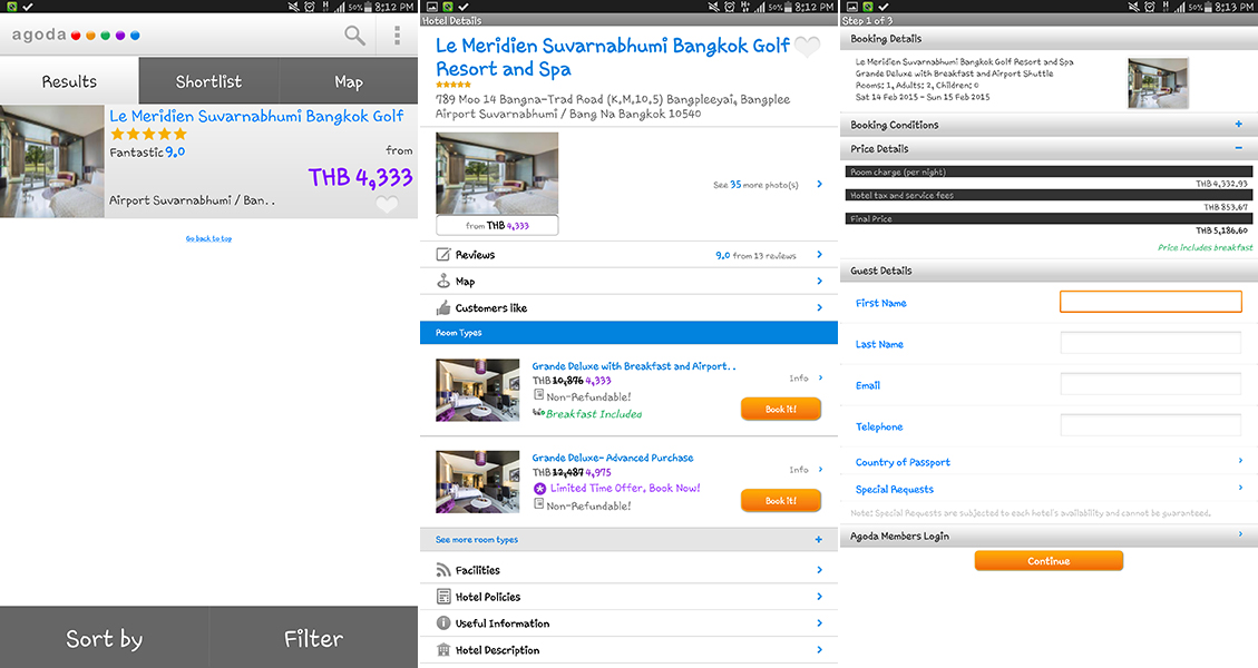 ผมจึงลองเปิดแอพพลิเคชั่น Agoda หาที่พักดู ไปเจอ Le Meridien Suvarnabhumi Bangkok ลดจากหมื่นกว่าบาท เหลือห้าพันเล็กๆ แถมคะแนนรีวิวจากทาง Agoda ก็สูงถึง 9.0 คะแนน มันต้องมีอะไรดีแน่ๆ จองเลยทันทีครับ