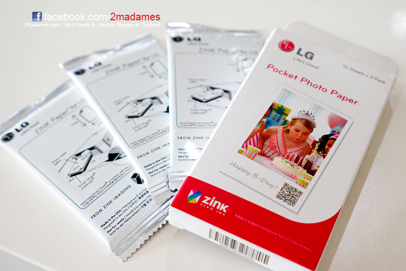 กระดาษพิมพ์รูปที่สามารถใช้กับเครื่องพิมพ์ LG Pocket Photo ได้จะต้องเป็น ”ZINK Paper” ซึ่งมีขนาด 2 x 3 นิ้วเท่านั้น มีแถมมาให้กับเครื่อง 10 แผ่น สามารถหาซื้อกระดาษเติมได้ที่ Jaymart และห้างไอทีทั่วๆไป ตกกล่องละ 399 บาท บรรจุกล่องละ 30 แผ่น และกระดาษแบบสติ๊กเกอร์ด้วย 30 แผ่น ราคา 450 บาท