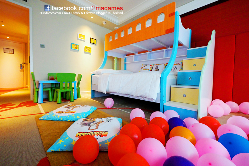 ห้องนอนของเด็กๆจะมีเตียงสองชั้นสีสันสดใส มีหมอนลาย Madagascar ตกแต่งด้วย ตอนจอง Request ขอลูกโป่ง เค้าก็จัดให้แฮะ