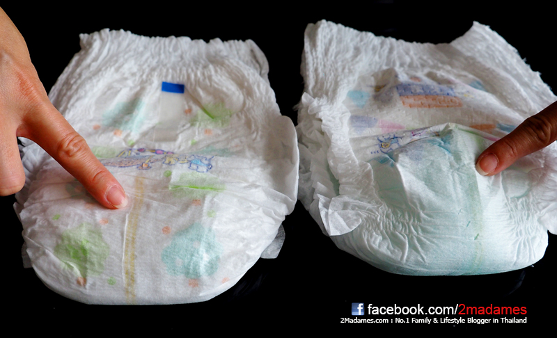 ยิ่งเรามีดูด้านข้าง เราจะเห็นชัดยิ่งขึ้นว่าของเมอร์รี่ส์ (ด้านซ้าย) บวมน้อยกว่าของผ้าอ้อมทั่วไป (ด้านขวา) พอสมควร