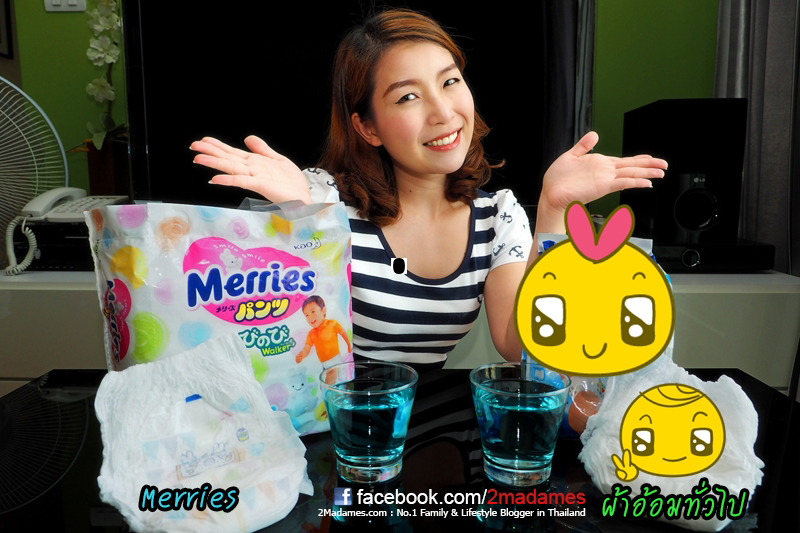 - เราพบว่าการซึมซับของเหลวทำได้ดีทั้งของ Merries และผ้าอ้อมทั่วไป