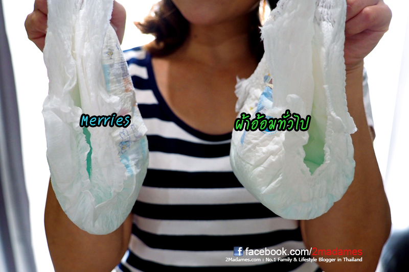 - แต่สิ่งที่แตกต่างกันอย่างเห็นได้ชัดคือ รูปทรงเมื่อผ้าอ้อมเต็ม อย่างของเมอร์รี่ส์จะบวมน้อยกว่าผ้าอ้อมทั่วไปที่บวมมากจนมาเบียดโคนขาและทำให้เด็กรำคาญกับความบวมของผ้าอ้อม