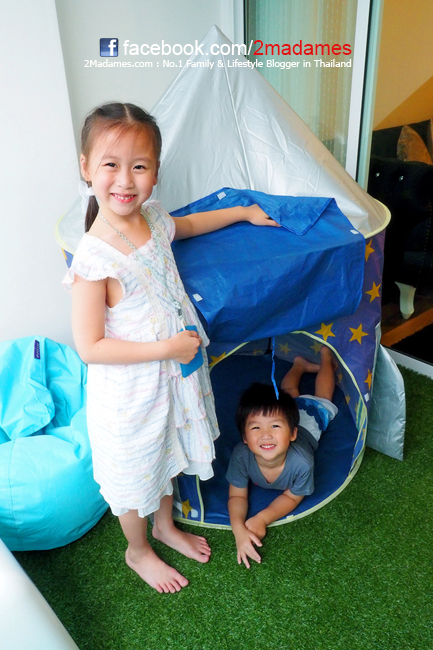 ระเบียงปูหญ้าเทียมสีเขียว มีของเล่นให้เด็กเพียบ ทั้งกระโจม ห่วงยางน้องหมา ม้าไม้ ฯลฯ