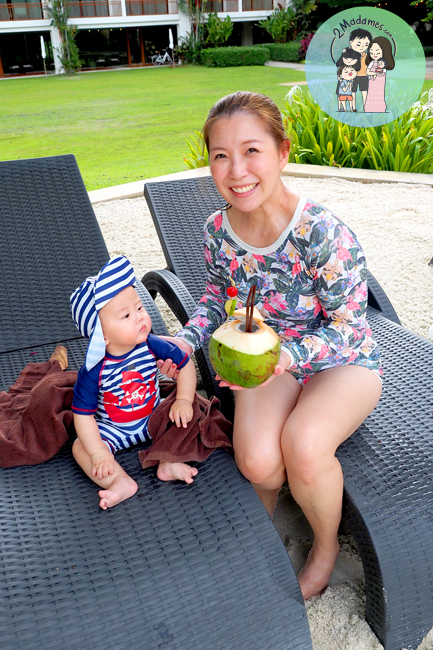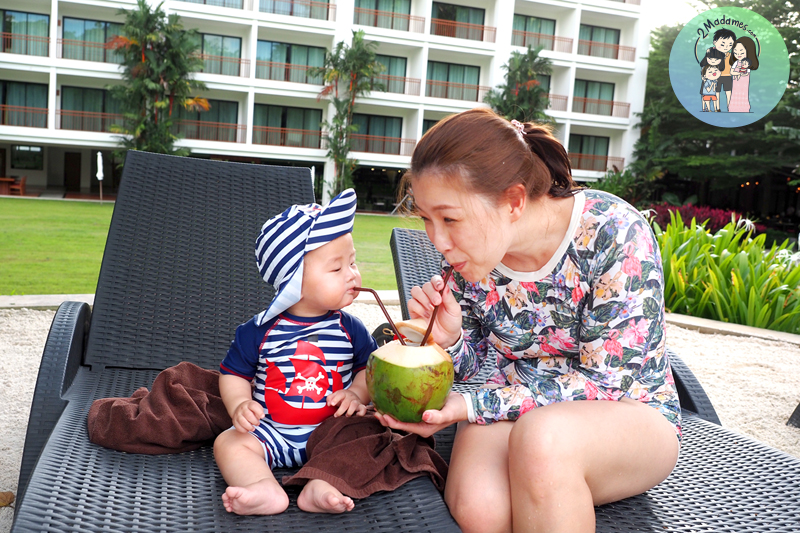 เล่นน้ำกันจนเหนื่อย สั่งน้ำมะพร้าวมาดื่มกัน น้องเกล็นอยากกิน ถึงกับจ้องลูกมะพร้าวตาไม่กระพริบเลย