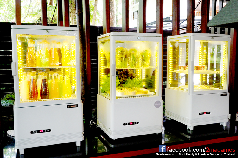 พวกน้ำผลไม้จัดใส่ขวด ผักสลัดต่างๆจัดใส่แก้วเป็นสลัดเชคให้เลย สะดวกดี แต่ถึงจะจัดแบบนี้ก็ห้ามหยิบกันเองนะ