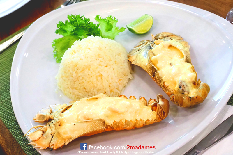 Rock Lobster Thermidor กั้งย่างซอสครีมไวน์ขาวเสิร์ฟคู่กับข้าวอบเนยกระเทียม เป็นเมนูที่เลิฟมาก เด็กๆชอบมาก ราคา 490 บาท