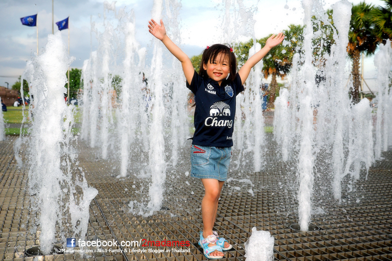 เด็กๆสนุกสนานกับน้ำพุด้านหน้าสนาม