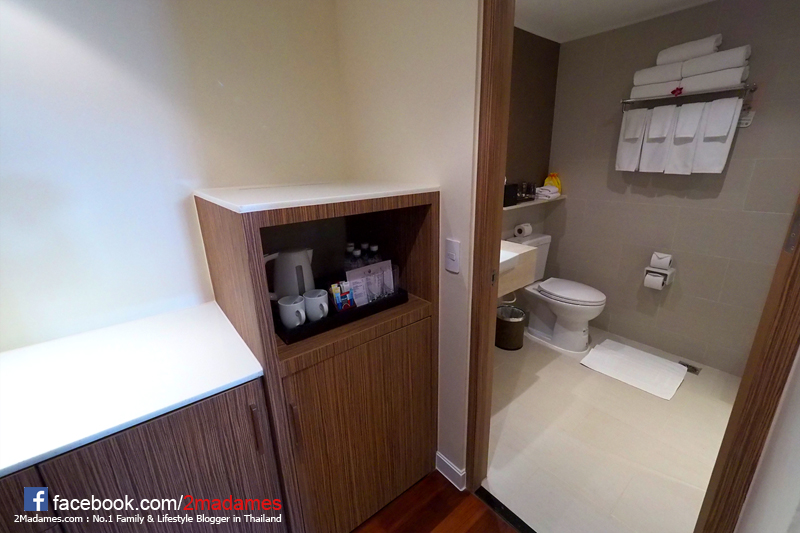 มาชมห้องพักกันต่อนะ หน้าห้องน้ำจะมี Pantry เล็กๆ ชากาแฟดื่มฟรีเลย ในตู้ก็จะมีตู้เย็นด้วย