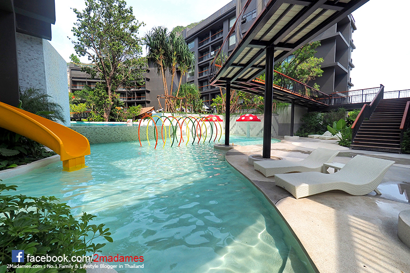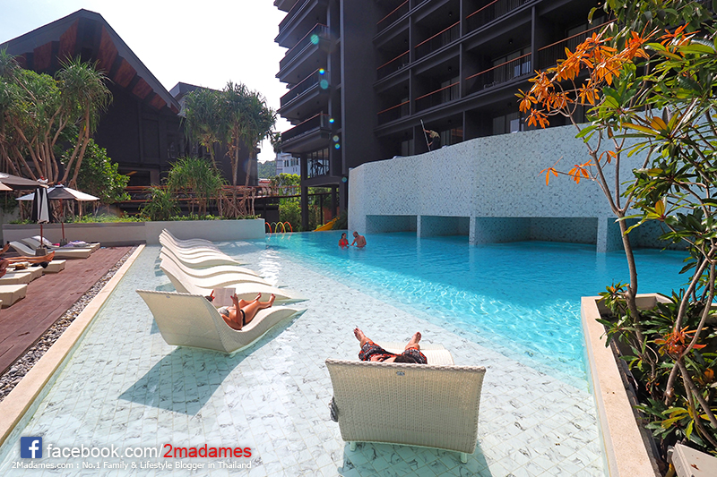 ชมห้องพักไปแล้ว เดี๋ยวพาไปดูสระว่ายน้ำดีกว่า เนื่องจากห้องที่เราพักเป็นแบบ Pool Access เด็กๆเลยกระโดดลงน้ำจากหน้าห้องพักได้เลย ส่วนคุณแม่แอนเตรียมเสบียงและเครื่องดื่มนั่งเฝ้าเด็กๆเล่นน้ำเพลินจ้า ช่วงที่พวกเราเข้าพักที่ Pool Bar มีโปรโมชั่นสั่งอาหารเมนูในรูปเป็นคล้ายๆแผ่นแป้งห่อด้วยผัดกะเพรา ต้องขออภัยที่จำชื่อไม่ได้ สั่งคู่กับซอฟท์ดริ้งค์ ราคา 199++ เองอ่ะ ถือว่าราคาไม่แพงเลย ส่วน Mocktail ในมือคุณนายแม่นั้นสั่งเพิ่มต่างหากจ้า