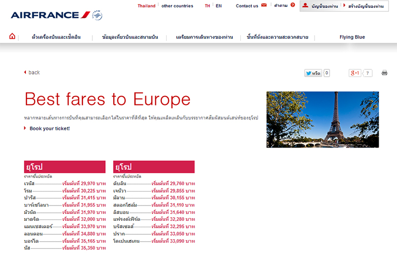 2.ตั๋วเครื่องบิน : มีเที่ยวบินตรงจากสายการบิน Air France บินตรงจากกรุงเทพ ถึง Paris ภายใน 12.30 ชั่วโมง ด้วยตัวเครื่องรุ่น Boeing 777-300 ซึ่งถือว่าเป็นเที่ยวบินที่รวดเร็วที่สุดแล้ว ราคาเริ่มต้นอยู่ที่สามหมื่นต้นๆด้วยเที่ยวบินตรง ต้องถือว่าไม่แพงเลย รายละเอียดเพิ่มเติม http://www.airfrance.com/cgi-bin/AF/TH/th/common/home/home/HomePageAction.do