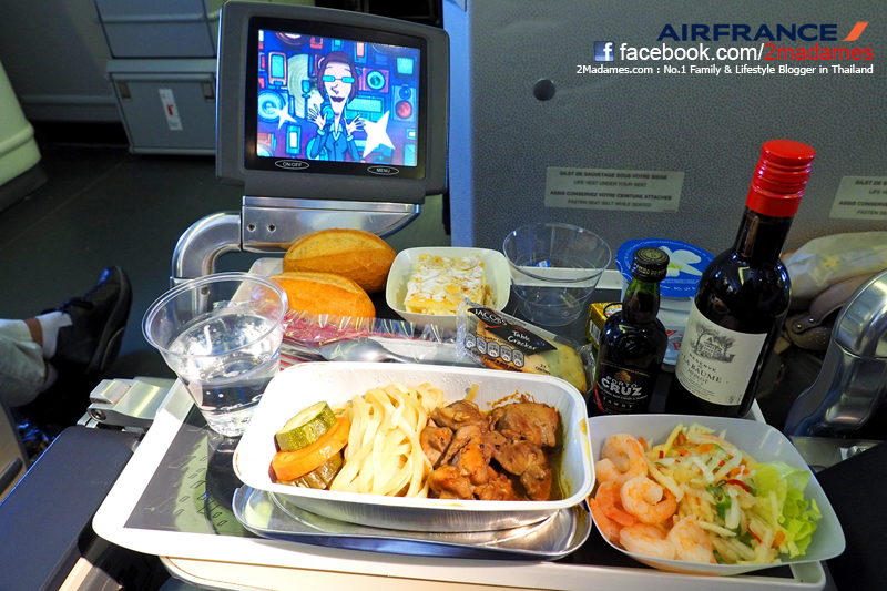 อาหารยกมาเสิร์ฟละ Appetizer เป็นส้มตำแบบฝรั่งๆรสชาติเปรี้ยวนำ Main Dish เป็นเส้นสปาเก็ตตี้กับไก่อบ ขนมอร่อยดีครับ แต่ที่ปลื้มมากๆคือ จัดไวน์ขวดเล็กมาให้คนละขวดเลย ดื่มแล้วหลับสบาย