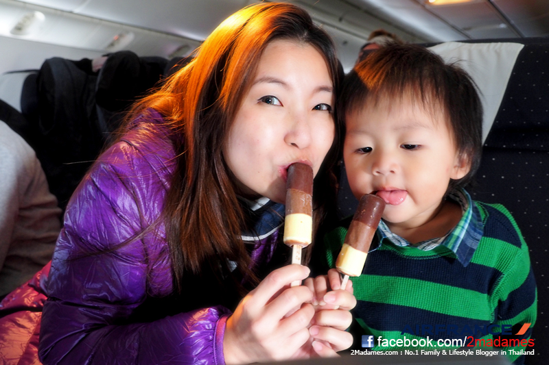 ไอติมแท่งก็มีนะ ไม่เคยกินไอติมแบบนี้บนเครื่องบินเลย น้องกายชอบมาก พ่อแม่ก็ปลื้ม