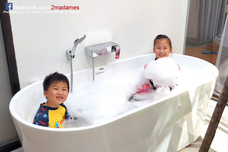 ห้องกว้างมาก มีอ่างแช่ตัวแบบ Outdoor ท่ามกลางกระจกใสกลางวิลล่าเลย