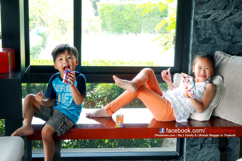 เด็กอิ่มอาหารเช้าแล้ว มาขออนุญาตทานขนมบ้าง นอนเล่นกันไป ดื่มน้ำผลไม้ไป สบายเค้าเลย