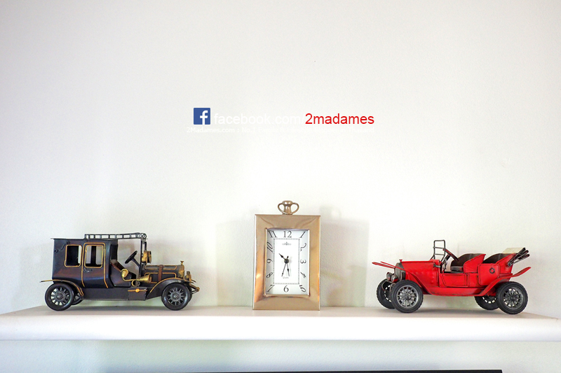 มีรถโบราณกับนาฬิกาตกแต่งอยู่บนชั้นวาง