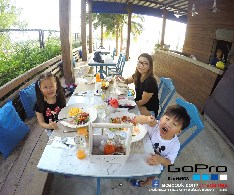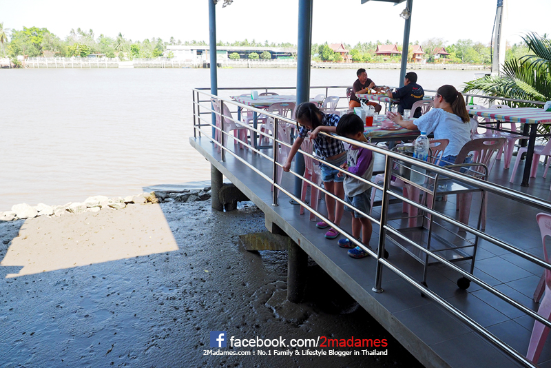 บรรยากาศของร้านอยู่ริมแม่น้ำเลย ลมโชยไม่ร้อนเลย ดินเลนตอนน้ำลดจะมีปูและปลาตีนมาเดินไปเดินมา เด็กๆก็เลยได้ชมสัตว์น้ำที่ไม่ค่อยได้เจอกันสนุกเลย