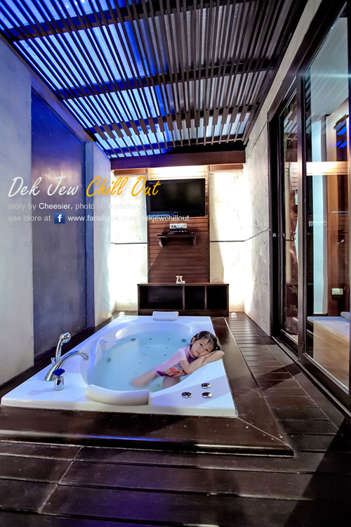 ที่ชื่อว่า Jacuzzi Villa เพราะมีอ่าง Jacuzzi อันใหญ่ตรงนี้ มีทีวีให้นอนดูทีวีไป แช่อ่างไปได้ด้วย
