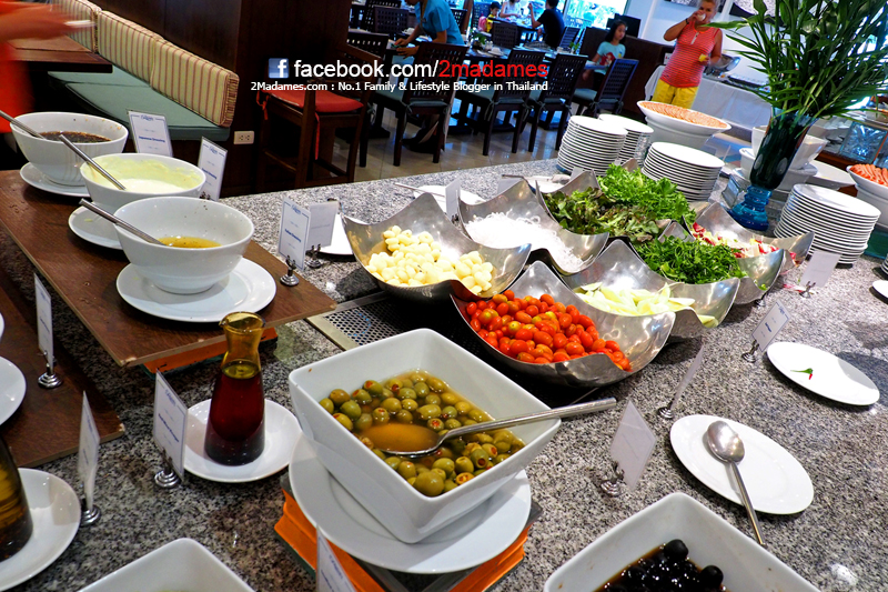 สลัดผักสดๆ มีน้ำสลัดให้เลือกเยอะมาก แถมมีน้ำมันมะกอกด้วย