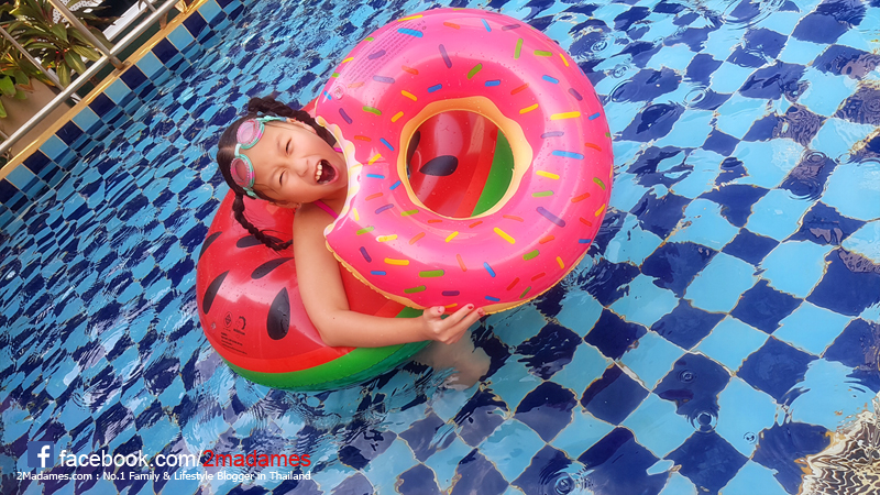 สระที่นี่จะเป็นสระเตี้ยๆ ปลอดภัยสำหรับเด็กทุกเพศทุกวัย มีสไลด์เดอร์กับห่วงยางให้เล่นสนุกกัน