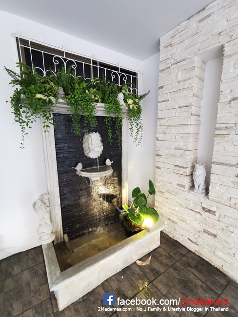โรงจอดรถมีพื้นที่เหลือนิดหน่อย เลยตั้งน้ำตกรูปสิงโตเพิ่มเสียงน้ำไหลให้กับบ้าน แถมได้ฮวงจุ้ยดีให้กับบ้านด้วยนะ