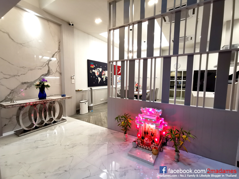 เข้าบ้านมาจะมีโถงใหญ่ทางเข้าชั้น 1 ซึ่งเดิมทีเปิดโล่ง เราเลยทำเป็น Partition จากแนวบันไดของบ้าน เพื่อให้เกิดโถงห้องใหม่ด้านหน้า ตรงนี้จะตั้งตี่จู๋เอี๊ยะ ด้านหลังของศาลควรทึบนะ โถงทางเข้าตรงนี้มีพื้นที่ตั้งของไหว้เวลาไหว้เจ้าด้วย มีกระเบื้องลายหินอ่อน COTTO GRANDE Collection แผ่นใหญ่ปิดผนังคู่กับโต๊ะ Console หินอ่อนแท้ เพื่อเพิ่มความ Luxury ให้กับบ้าน