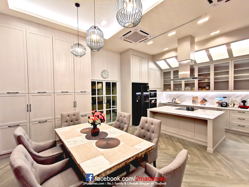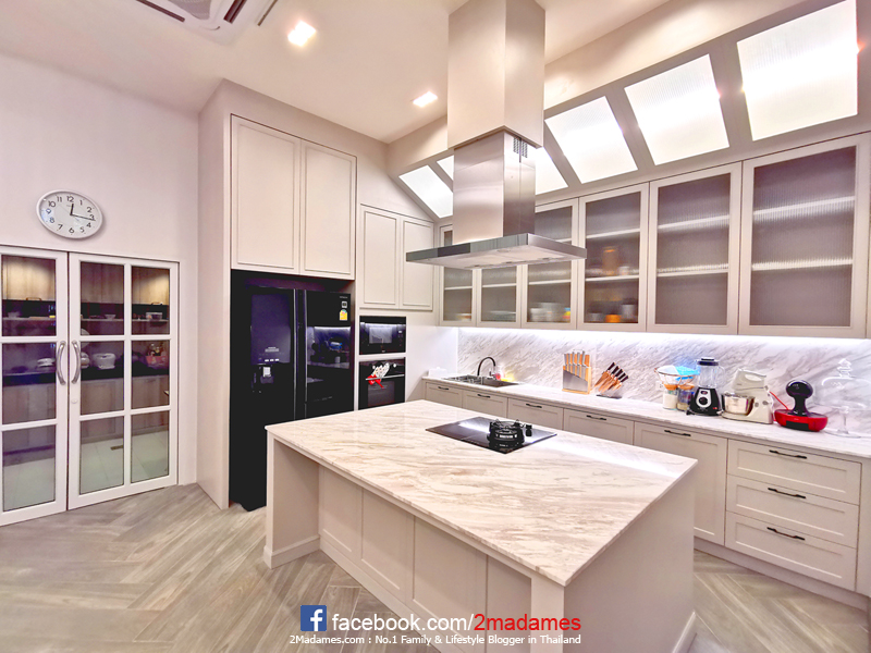 ส่วนครัวนั้นออกแบบมาให้เหมือนเป็น Glass House จำลอง มีไฟด้านในเหมือนกับแดดที่ส่องลงมายังห้องกระจก Island ตกแต่งด้วยหินอ่อนแท้ วางเตาไว้ทั้งแบบเตาไฟฟ้าและเตาแก๊สเลย