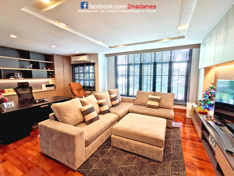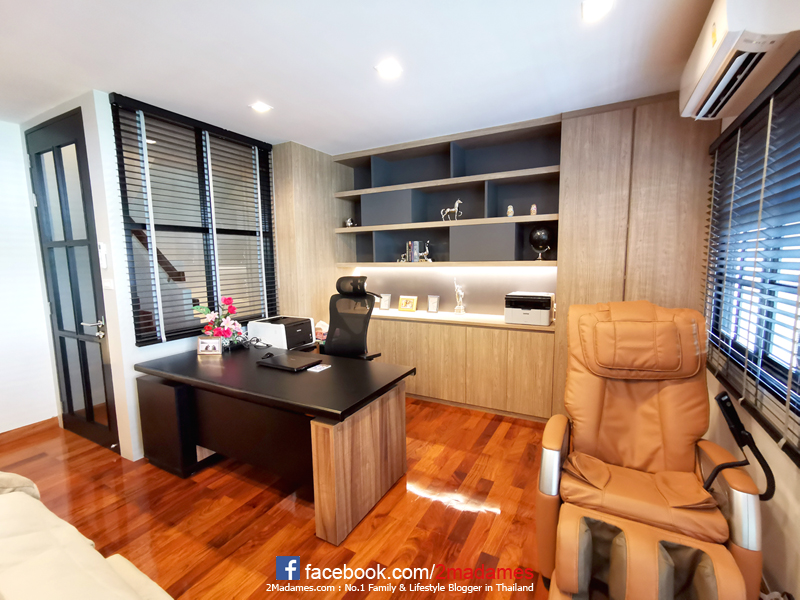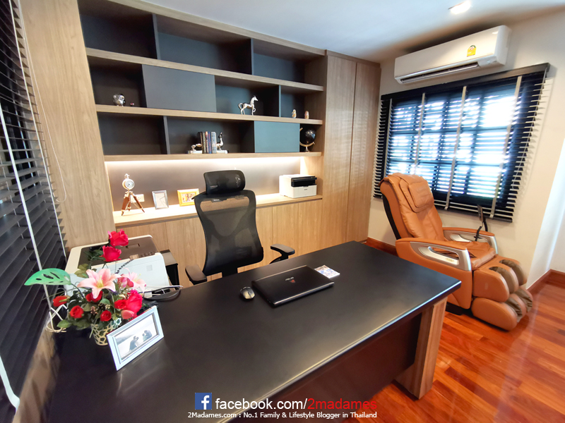 ด้านหลังโซฟา เราเลือกจัดเป็นมุมทำงานครับ แต่ก็มีความ Relax ด้วยเก้าอี้นวดอีกข้าง ซึ่งตรงนี้บางทีผมก็นั่งเล่นคอมพิวเตอร์ไปก็มองดูทีวีได้ด้วย เรียกว่ากึ่งทำงานกึ่งนั่งเล่นครับ