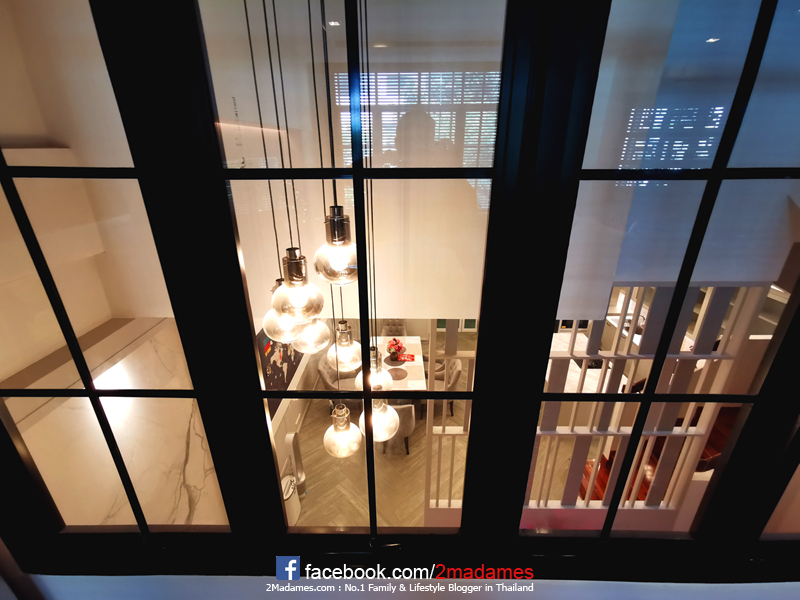 บริเวณชั้น 2 นี่ทำกรอบกระจกสีดำ มองลงไปชั้น 1 ก็จะเห็นโถงทางเข้าบ้าน และห้องทานข้าว แขกไปใครมาก็มองจากห้องนั่งเล่นนี้ได้ แขวนโคมระย้าให้แสงสว่างทั้งชั้น 1 และ 2 เลย