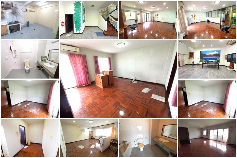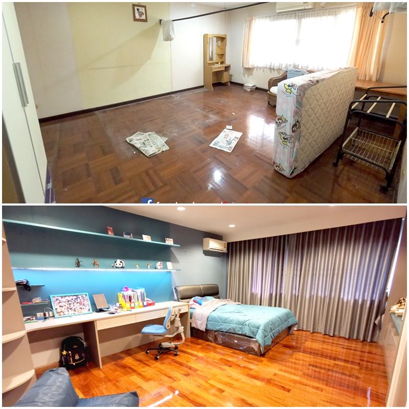 พื้นห้องเดิมเป็นไม้แดงปูปาร์เก้แบบโบราณๆ ผมเลยเปลี่ยนพื้นเป็นไม้มะค่าแทน หาไม้มาจากแถวๆร้านขายไม้ของเพื่อนสมัยเรียนย่านบางโพ ราคาแพงมาก (ค่าไม้ ตร.ม.ละเกือบสองพัน ค่าปุค่าขัดค่าทำสีอีกราวๆ ตร.ม.ละ 580 บาท ทำทั้งหลังเกือบๆหกแสนบาทเลยครับ) แต่กัดฟันเพราะเราอยู่เองยาวๆ ชอบฟิลลิ่งของเท้าเวลาเดินบนไม้จริงมากๆครับ