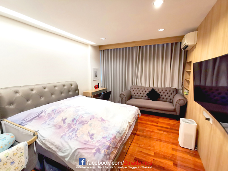 เดิมทีห้องนี้เป็นห้องใหญ่นะครับ แต่เราเลือกจะกั้นแบ่งเป็นโซนห้องนอนและโซนห้องแต่งตัว มีประตูกั้นปิดเวลานอนจะได้ไม่เปลืองแอร์