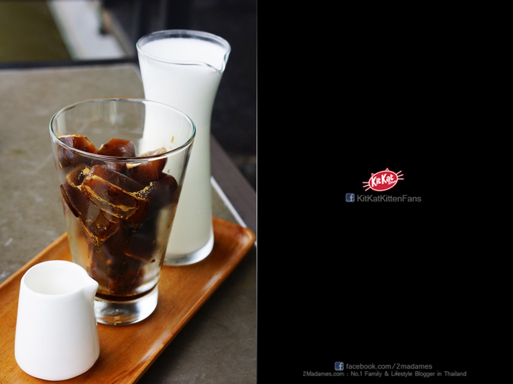 กาแฟแบบก้อนน้ำแข็ง ใส่มาในแก้วใสเสิร์ฟพร้อมนมและน้ำเชื่อมค่ะ