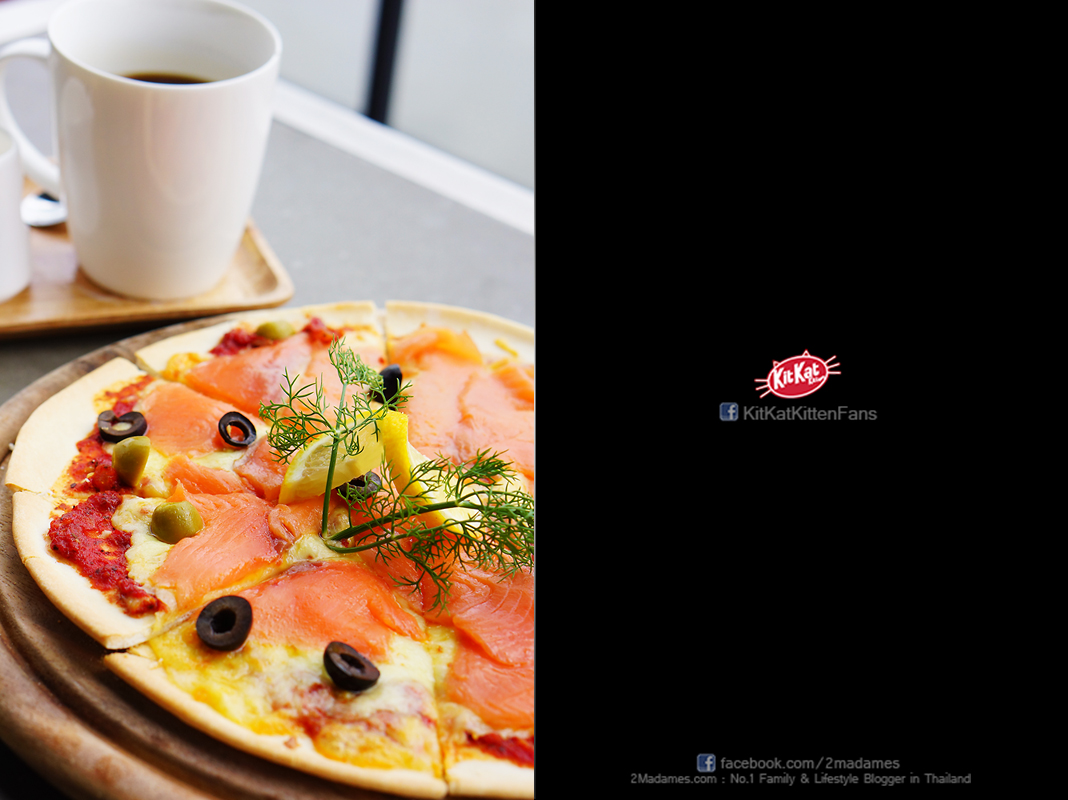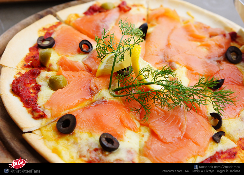 เจ้าพิซซ่าบางกรอบหน้าแซลมอนรมควัน เข้ากับมะกอกและซอสมากๆ
