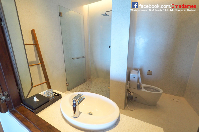 ห้องอาบน้ำมีประตูสองฝั่งเลย ห้องอาบน้ำกว้างมาก มี Rain Shower ด้วย